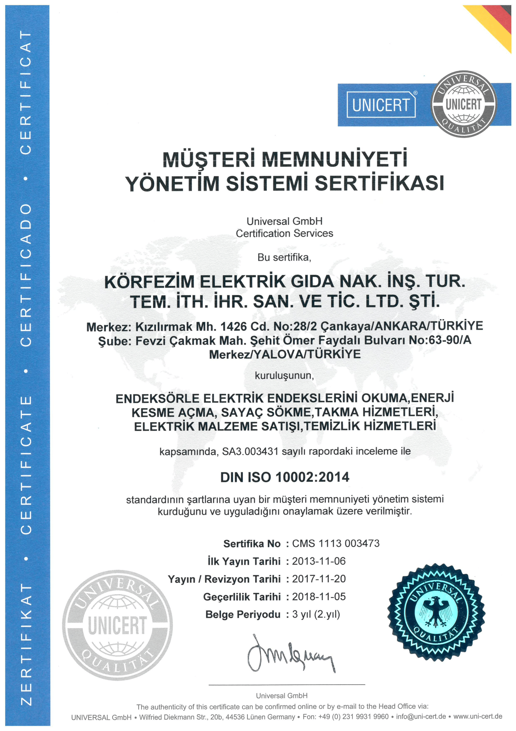 Hizmet sektöründe kalitenin önemini savunan şirketimiz sağlam temellere sahip yüksek rekabet gücüne erişebilmesi için Ulusal Kalite Hareketi'ne 2012 yılında katılmış olup kalitesinin sürekli zenginleştirilmesi yükseltilmesi ve yenilenmesini amaçlamıştır.